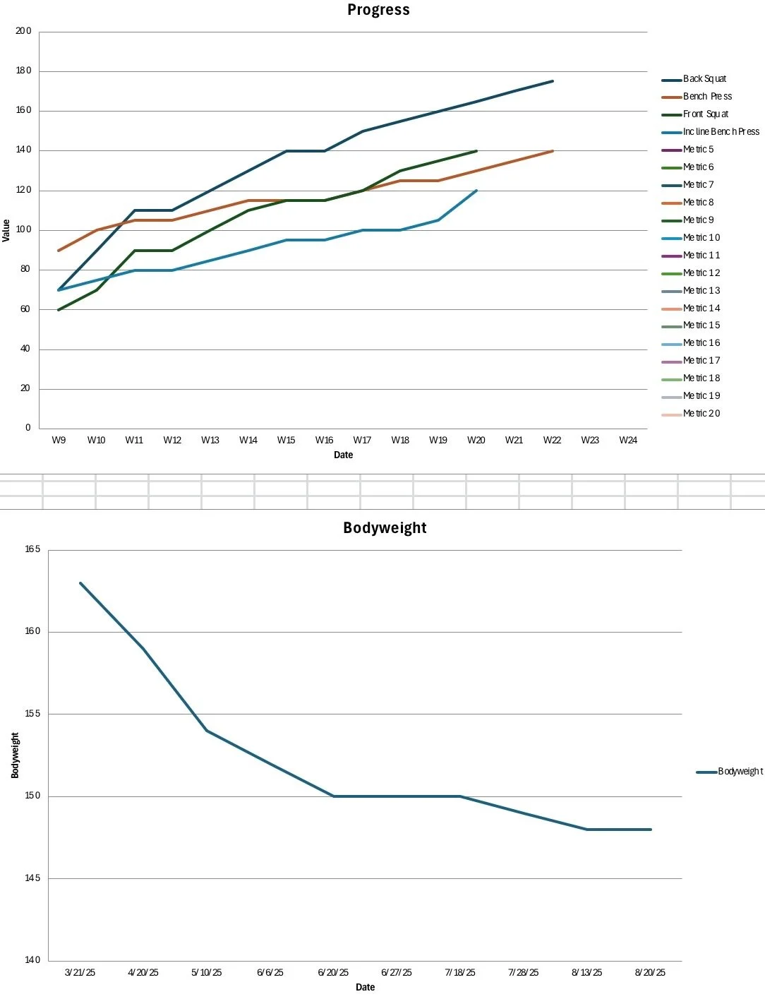 A personal performance tracking dashboard that shows weekly progressions of main exercises, testing & 1RM progressions, and bodyweight changes over time (yes, these are real results from one of my clients).